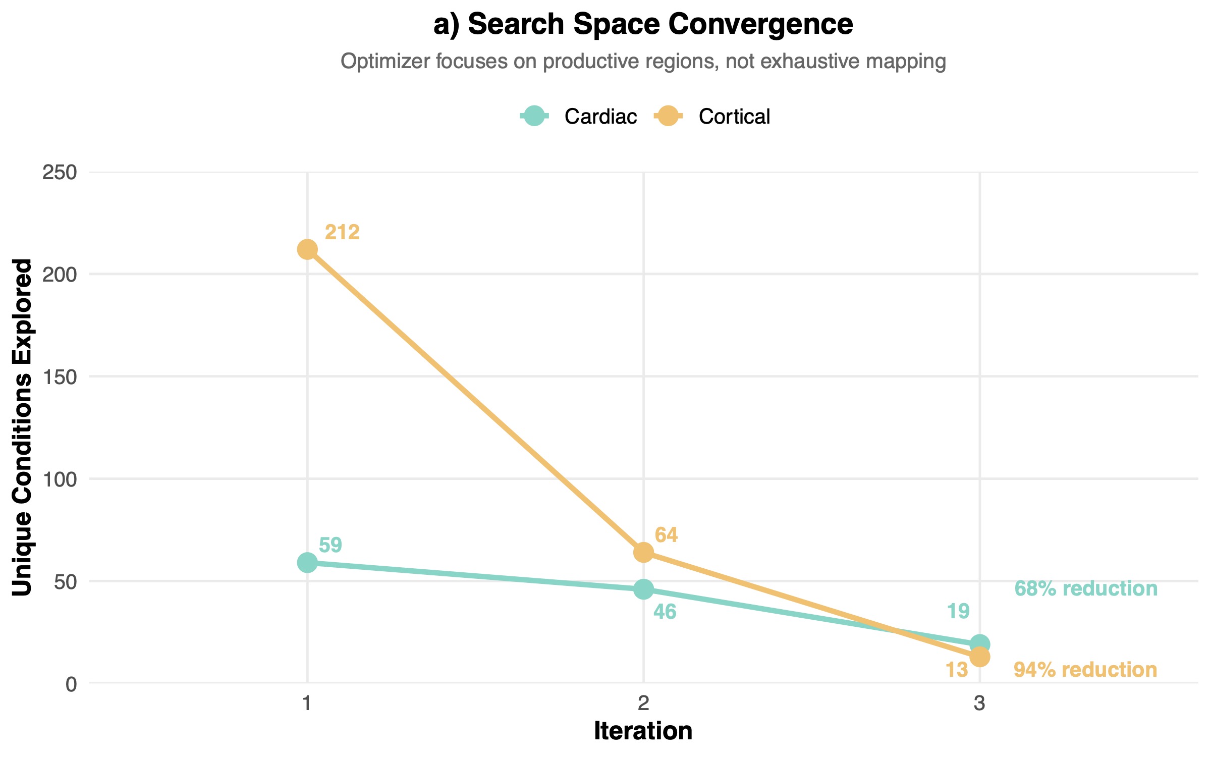 The cortical program also displayed more aggressive convergence, with 94% vs 68% reduction in unique tested conditions (Figure 3a). The aggressive compression in the search space across the two programs highlighted the power of in silico design of experiment approaches for tissue engineering. Notably, given that optimization reduces failed experiments, labor hours per construct, and reagent usage per iteration, costs declined with iteration count. The experimental costs per experiment in dollar terms dropped robustly as we cycled through each iteration: in the cortical program they dropped by 70.7%, in the cardiac program costs dropped by 74.3% (Figure 3b).