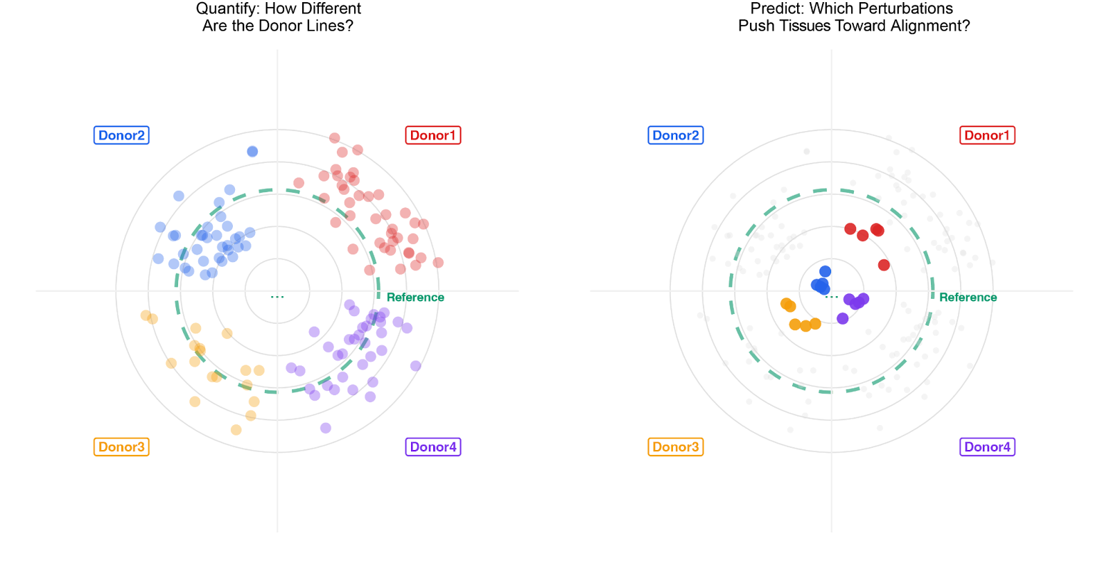 Figure 1: Cross-donor generalization of cortical alignment through AI-guided optimization. Left: bull's-eye plots quantifying inter-donor phenotypic variability across four iPSC lines (Donors 1–4) and a reference line. Each dot represents a single tissue unit; position toward the center indicates higher axonal-dendritic alignment. Initial perturbation conditions produce significantly different structural phenotypes across donors. Right: after quantification, the platform identifies perturbations that pushed all lines toward highly aligned tissue