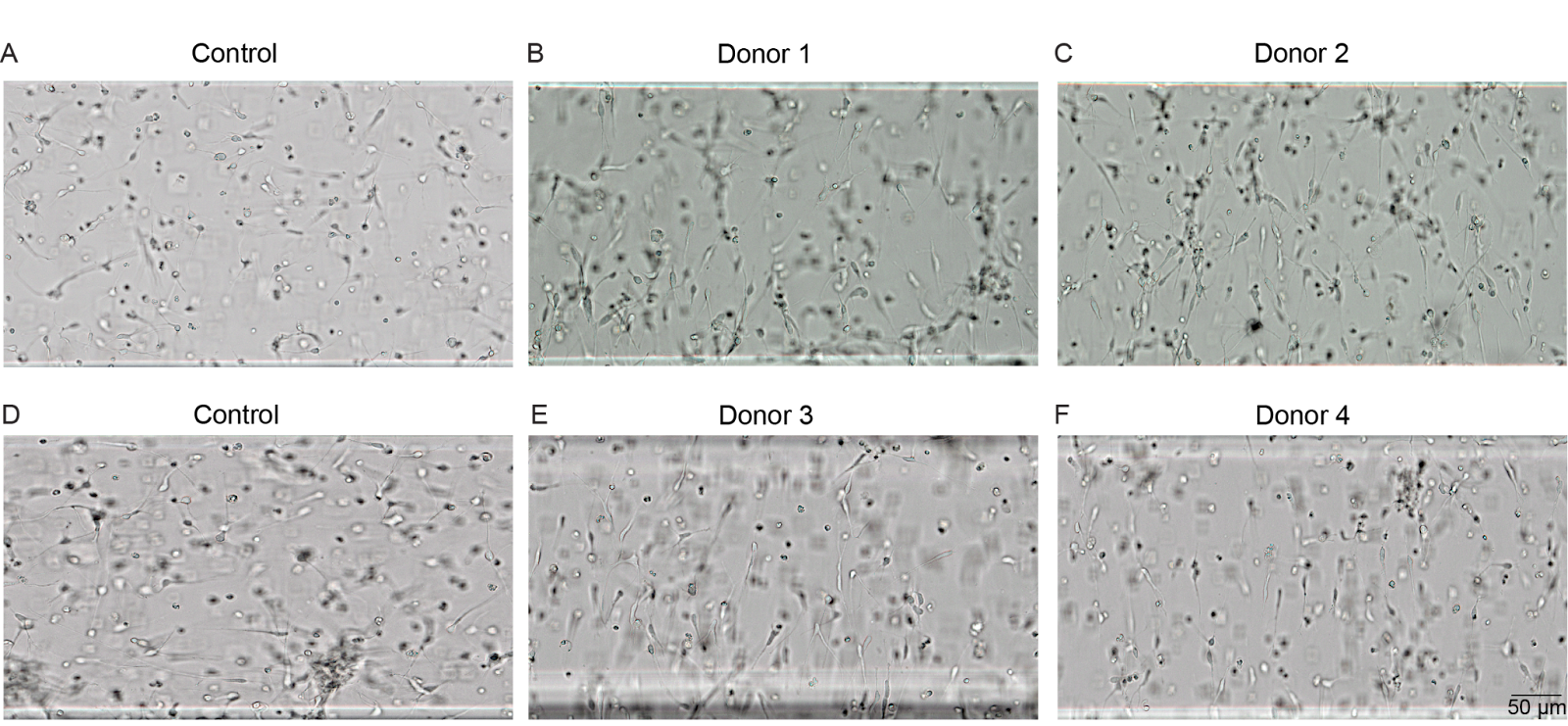 Figure 2: Reproducible neurite alignment across donor iPSC lines. Bright-field images of cortical neuron constructs in Polyphron’s platform. (A, D) Control conditions showing randomly oriented neurites. (B) Donor 1, (C) Donor 2, (E) Donor 3, and (F) Donor 4 under donor-specific optimized perturbation conditions, demonstrating consistent directional alignment across all four genetically distinct donor lines. Scale bar, 50 µm.
