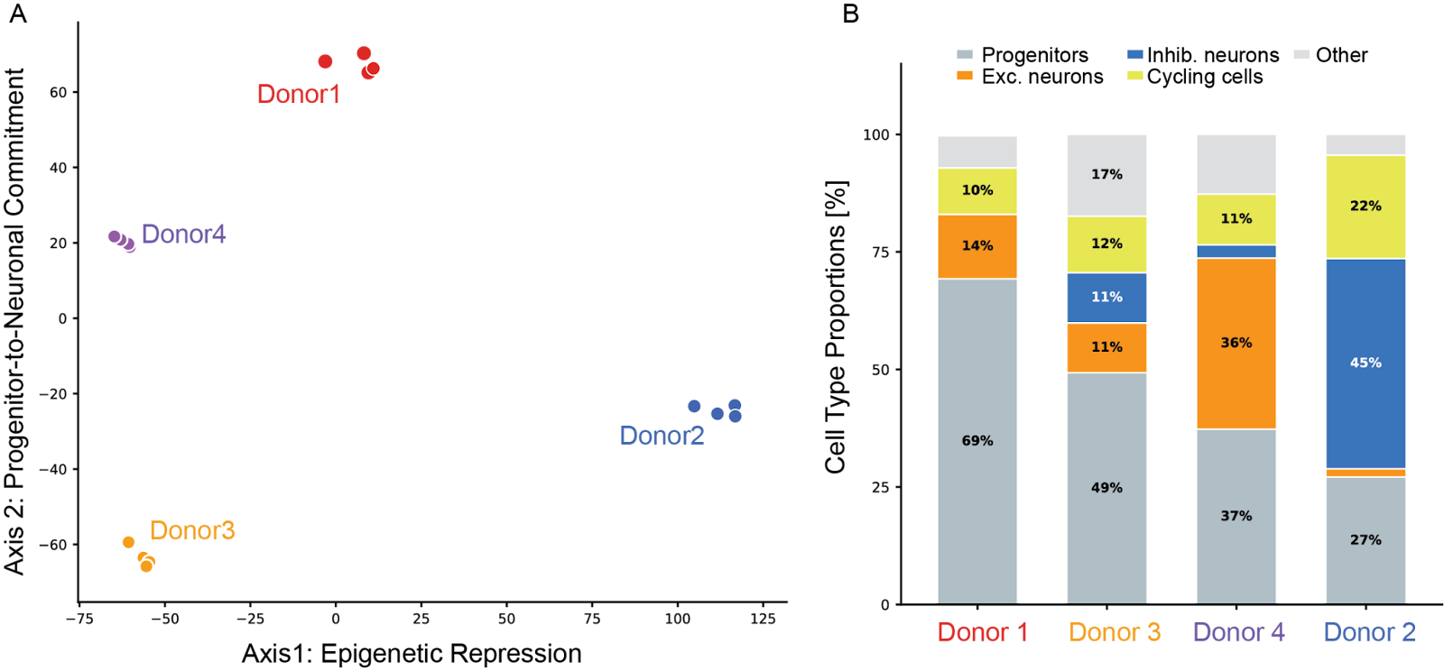 - Axis 2: Progenitor-to-neuronal commitment (PC2, 17.2% variance). The second axis separated Donor 1 from Donor 3, with Donor 4 falling in the middle. Donor 1 expressed progenitor- and stem cell-like transcriptional programs. In contrast, Donor 3 expressed a neurogenically primed signature and neuron-specific epigenetic drivers.